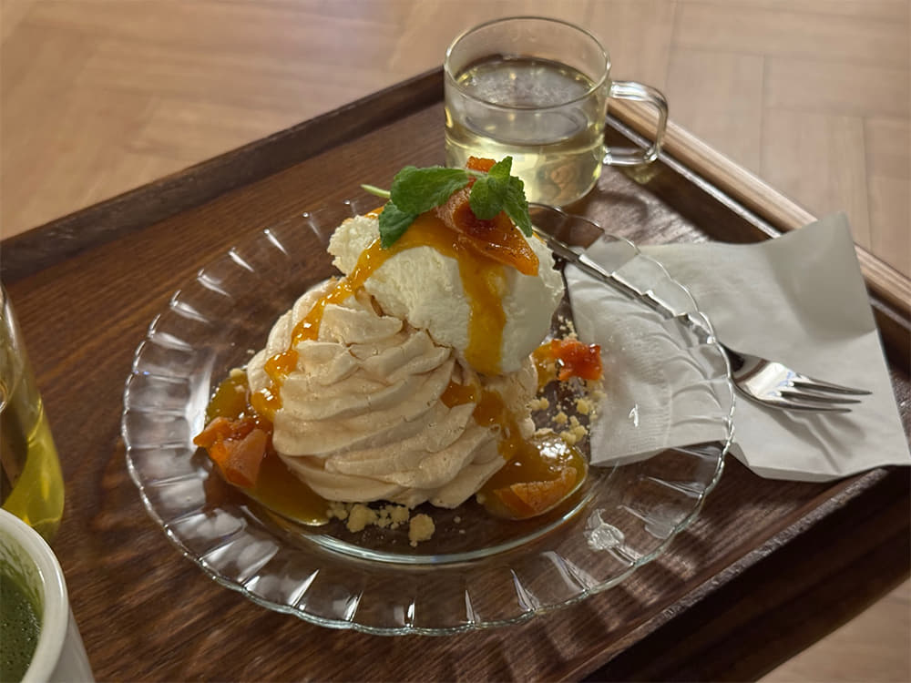 홍시는 매우 달콤하지만, 이 파블로바는 그 달콤함을 과하지 않고 세련되게 담아냈다. 파블로바 베이스는 쫄깃하면서도 바삭하고, 홍시에서 우러난 은은한 오렌지빛이 감돈다. 그 위에는 가벼운 크림과 통통한 홍시 조각이 올려지고, 마지막으로 홍시 시럽이 은근하게 뿌려진다. 따뜻한 녹차 한 잔과 함께 완벽한 맛의 균형을 경험해보기를 추천한다.