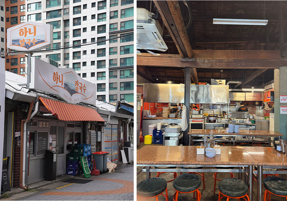 외관은 마치 수십 년 된 골목 노포 식당처럼 소박하지만, 내부에 들어서면 의외로 현대적이고 감각적인 공간이 펼쳐진다. 용산 몽탄, 약수 금돼지식당, 청담 뜨락 등 소문난 맛집 대표가 만든 ‘코리아 미트 클럽’의 솜씨다. 2021년 문을 연 하니칼국수는 노포 같은 정겨운 분위기를 살리면서 위생의 신뢰도를 높이기 위해 오픈 주방을 택했다. 바 테이블도 배치해 혼밥이나 혼술을 즐기기에도 좋다.