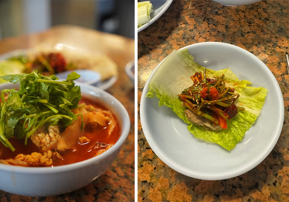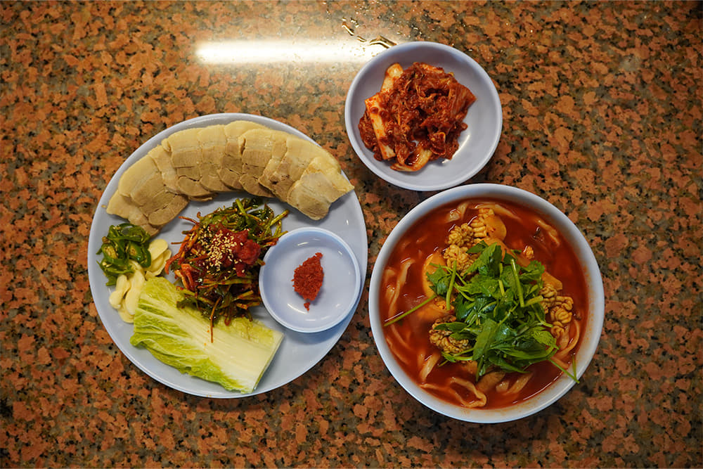 대표 메뉴는 알곤이칼국수. 신선한 명란과 곤이를 푸짐하게 담아주는데, 쫄깃한 생면과 얼큰한 육수가 어우러져 깊은 감칠맛을 낸다. 기후변화로 국내산 명태가 거의 잡히지 않아 최상급 러시아산으로 사용하며, 1년 이상 냉동 숙성된 명란을 사용한다고. 하니보쌈을 주문해 배추 위에 두툼한 수육을 얹고 함께 나오는 명태 미나리 무침과 청어알에 싸먹으면 더욱 맛있게 즐길 수 있다. 공기밥을 무료로 제공한다.