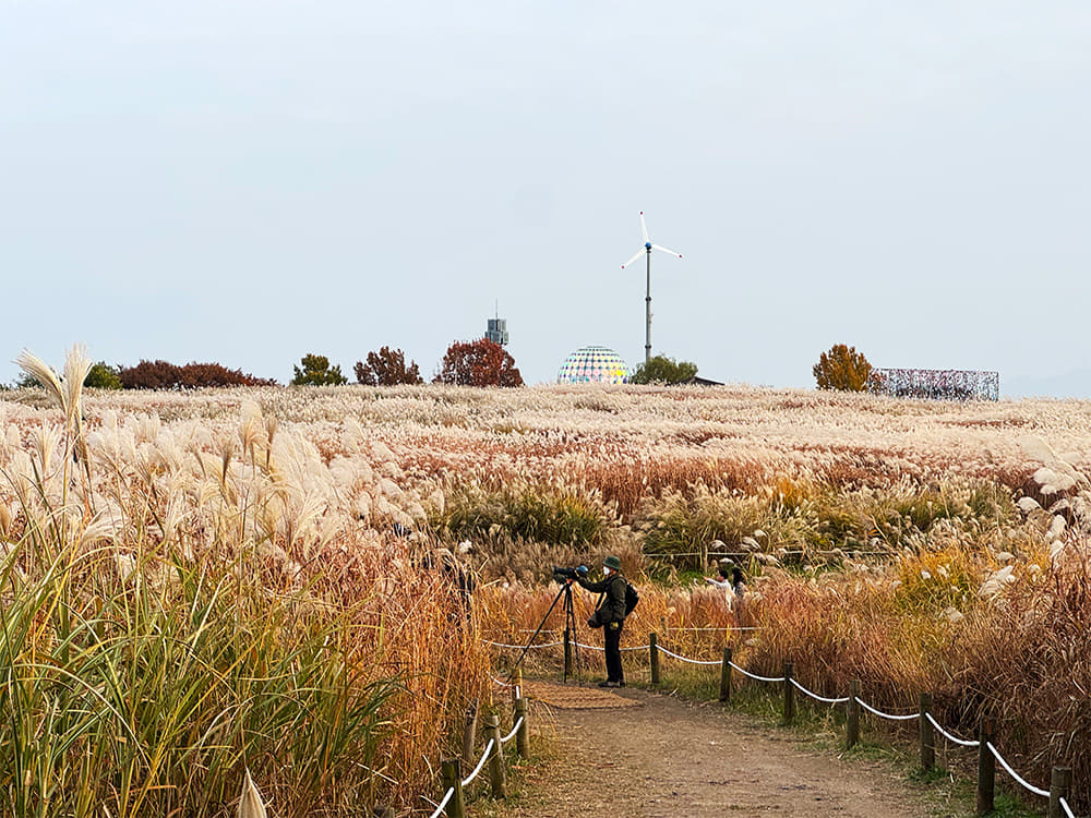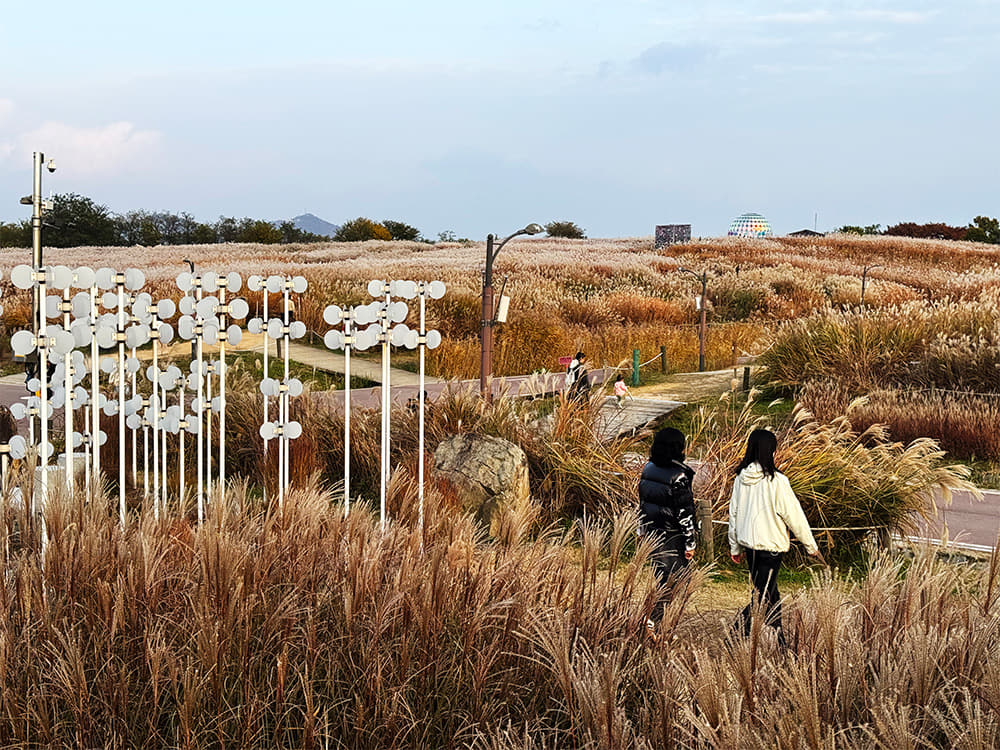 그러나 나무를 식재하기에 토양층이 너무 얕아 물을 품지 못했고, 결국 건조한 환경에서도 잘 자라는 억새를 심었다고 한다. 척박한 땅에서 자연이 어떻게 시작되는지 보여주는 공간인 셈이다. 10월 중순 억새축제가 열렸던 흔적이 남아 있었다. 군데군데 설치한 작가들의 조형물은 좋은 포토 스폿이 되어 주었다.