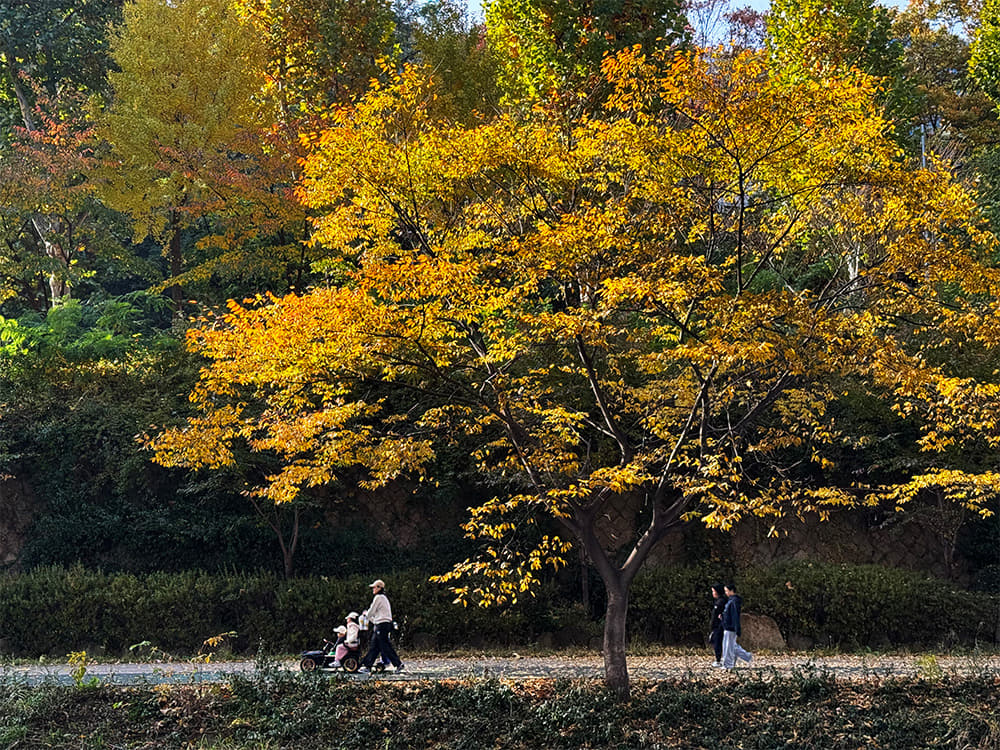 월드컵경기장역 주변에 따릉이를 반납하고 하늘공원으로 향했다. 지그재그로 설계된 하늘계단을 따라 정상으로 향하는 길, 뒤를 돌아보니 회색 건물 사이로 알록달록한 단풍이 들어 도시 전체가 화사하게 웃고 있는 듯했다.